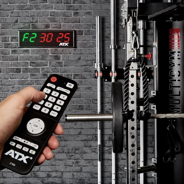 Programmable ATX interval timer with LED display and rechargeable battery for use in the gym or club. Clearly displays the time, laps and training phases. Stores up to 10 custom programs and offers preset modes such as Tabata. With remote control, stopwatch function, countdown and loud signal tone for start, end and pauses.