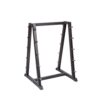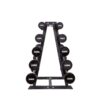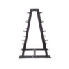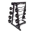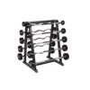 The enclosed stand offers space for all ten dumbbells. The construction is made of powder-coated steel. The shelves are aligned horizontally and specially designed for compact barbells.