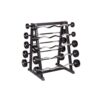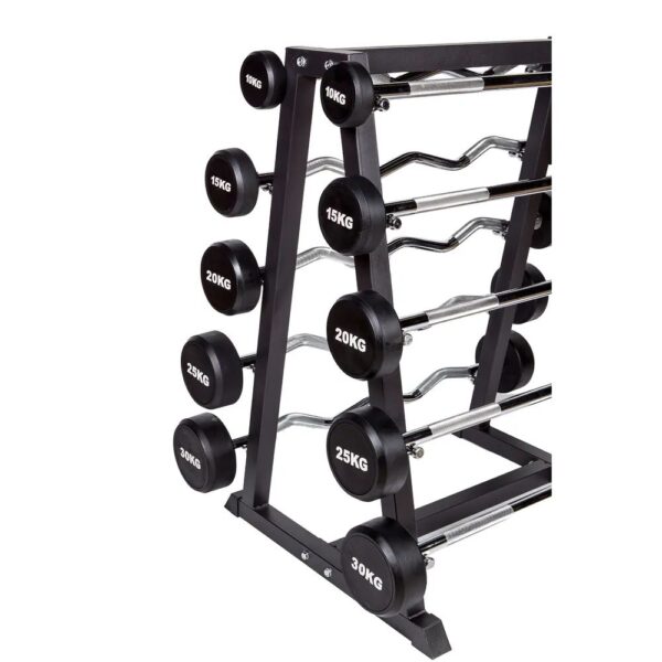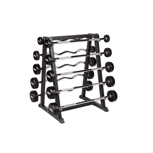 Set of 10 compact barbells - five SZ curl bars and five straight barbells - in the weight categories 10 kg to 30 kg. Includes matching rack.