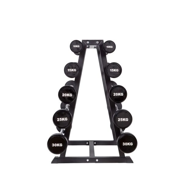 All dumbbells have a rubberized disc coating and are firmly attached to the bar. The construction is designed for long-term use in strength training.