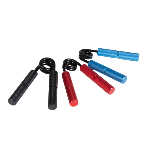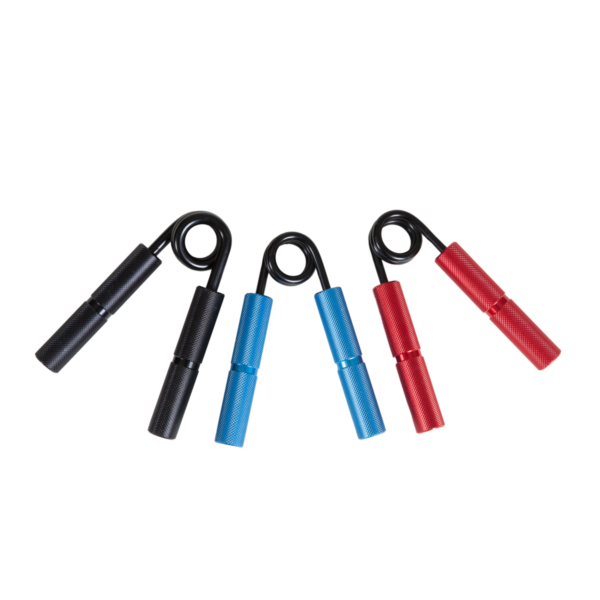 Aluminum hand exerciser for targeted training of hands and forearms. Available in light, medium and strong levels, with knurled handles (ร˜ 18 mm) and a robust steel compression spring, it is ideal for improving grip strength.
