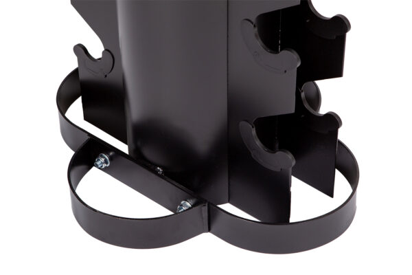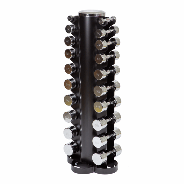 La solution de rangement peu encombrante est rendue possible par le Vertical Dumbbell Rack (dimensions : 48 x 42 x 127 cm) qui permet de stocker les haltères de manière sûre et ordonnée. Ce rack offre non seulement une manière stable et pratique de ranger les haltères, mais il contribue également à l'esthétique de la zone d'entraînement grâce à son look élégant.