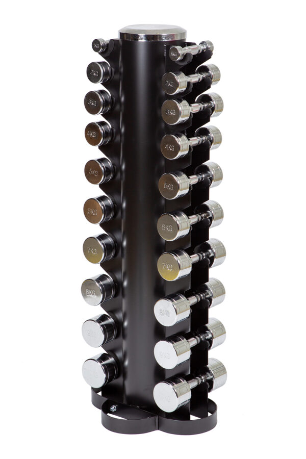 Le Chrom Dumbbell Set 1-10 kg offre un choix d'haltères de haute qualité pour un entraînement intensif : 10 paires d'haltères en acier chromé, rangées dans un Vertical Dumbbell Rack stable et peu encombrant. Idéal pour la musculation et les exercices d'endurance.
