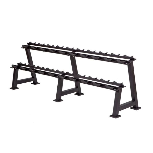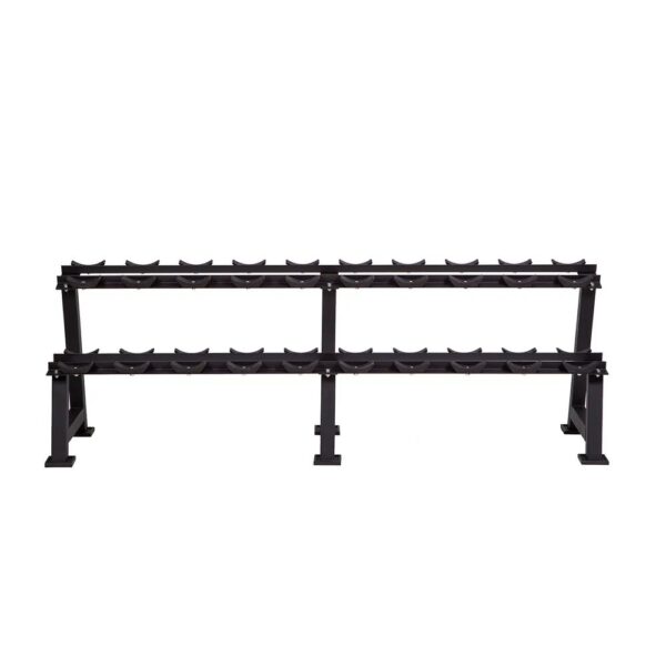 Round Dumbbell Rack : support pour jusqu'à 10 paires d'haltères. Construction robuste en acier, peinte en noir, avec 240 cm de largeur, 80 cm de hauteur et 57 cm de profondeur. Structure à deux niveaux pour un rangement clair. Chaque plateau mesure 14 cm de large et 20 cm de long. Charge maximale de 1200 kg, poids de 51 kg pour une bonne stabilité. Convient pour des haltères courts usuels avec une longueur de poignée de 15 cm.