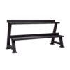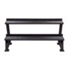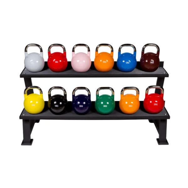 Kettlebell Rack : support pour jusqu'à 20 kettlebells. Construction solide en acier, peinte en noir, avec une largeur de 150 cm, une profondeur de 58 cm et une hauteur de 76 cm. Deux niveaux de rangement pour un rangement clair. Espace pour jusqu'à 12 Competition Kettlebells ou 20 Kettlebells standard. Suffisamment de place pour différentes tailles. Position sûre, idéale pour une zone d'entraînement bien ordonnée.