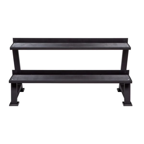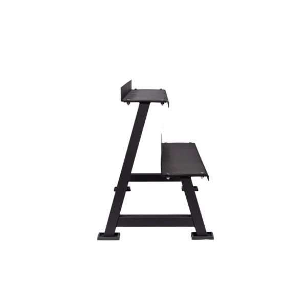 Avec deux niveaux de rangement et une construction solide en acier, le rack garantit une vue d'ensemble et un accès rapide pendant l'entraînement. Les surfaces de rangement généreuses d'une largeur de 147 cm et d'une profondeur de 23 cm offrent suffisamment de place pour stocker clairement différentes tailles de kettlebell.