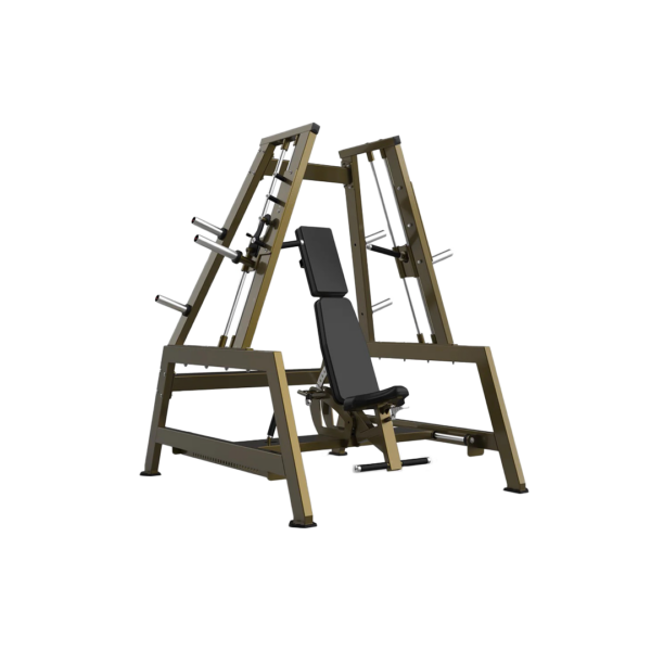 RealLeader USA Dual Bench Smith Machine LD-1008 - Robusta panca inclinata con pressa convergente su guide di scorrimento per un movimento fluido e naturale. Sedile regolabile in altezza con leva, pedali per il supporto, carico di piastre di peso su entrambi i lati con spazio per riporre i pesi. Design ergonomico per movimenti fisiologicamente ottimizzati. 210 x 194 x 206 cm, 260 kg. Struttura nera opaca, rivestimento nero.