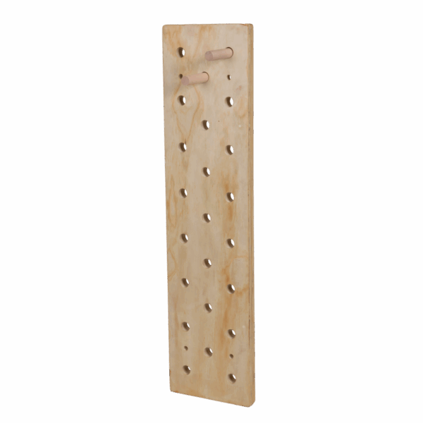 La pegboard รจ un dispositivo di allenamento a parete per l'allenamento intensivo della parte superiore del corpo e della forza di presa. ร disponibile in tre dimensioni: 1,02 m (laccato nero), 1,20 m (legno naturale) e 2,40 m (legno naturale). La robusta struttura in legno consente di eseguire un'ampia gamma di esercizi utilizzando il peso del proprio corpo. L'uso di pioli di legno in diversi fori permette di eseguire movimenti di arrampicata ed esercizi di tenuta che fanno lavorare in modo specifico spalle, braccia, schiena e busto. La tavola รจ adatta ad aumentare la forza massima e a promuovere la resistenza. Tutte le varianti sono progettate per l'uso fisso a parete e vengono fornite con gli accessori di montaggio adatti. Il numero di fori e il design variano a seconda del modello.