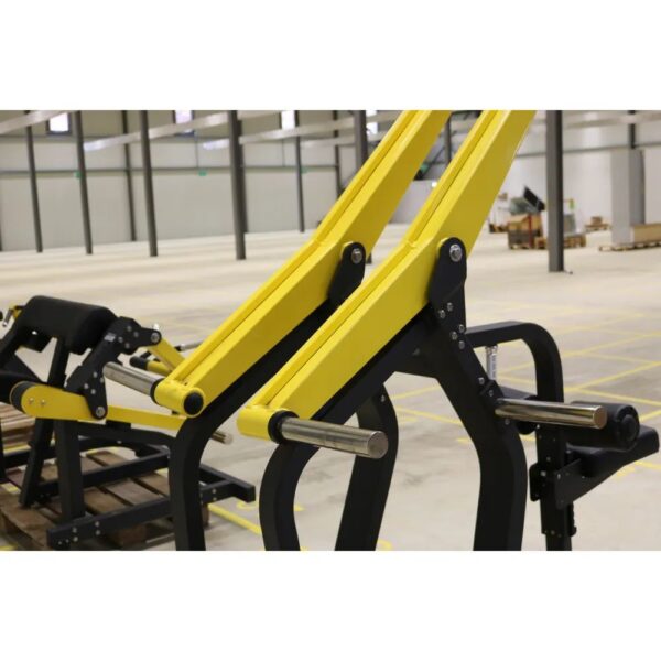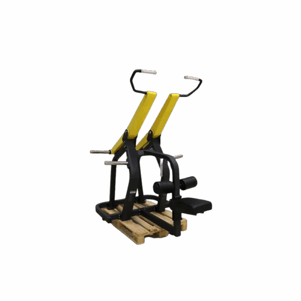 Plate Loaded Lat Pull Down für gezieltes Rückentraining. Höhenverstellbarer Sitz, robuste Stahlrohrkonstruktion, geeignet für 50 mm Gewichtsscheiben. In sportlichem schwarz-gelb, neu und ungebraucht.